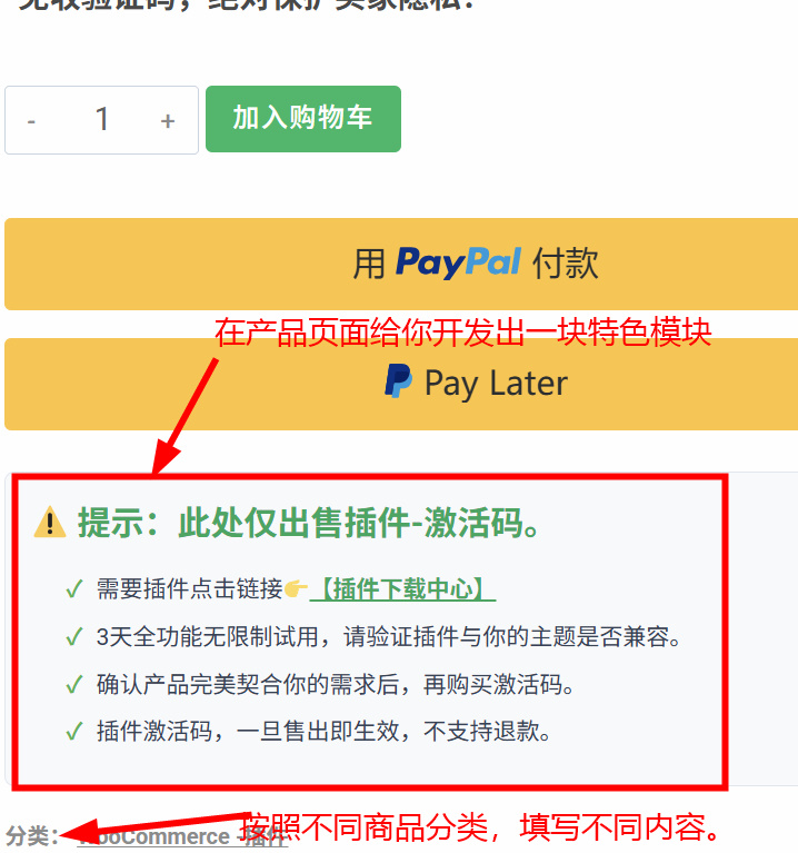 智能分类绑定(千类千面): 后台提供多达 10 个独立槽位,您可以将完全不同的免责声明、退款政策或促销文案,精准绑定到特定的商品分类上。卖实体显示包邮,卖虚拟显示下载链接,互不干扰!
